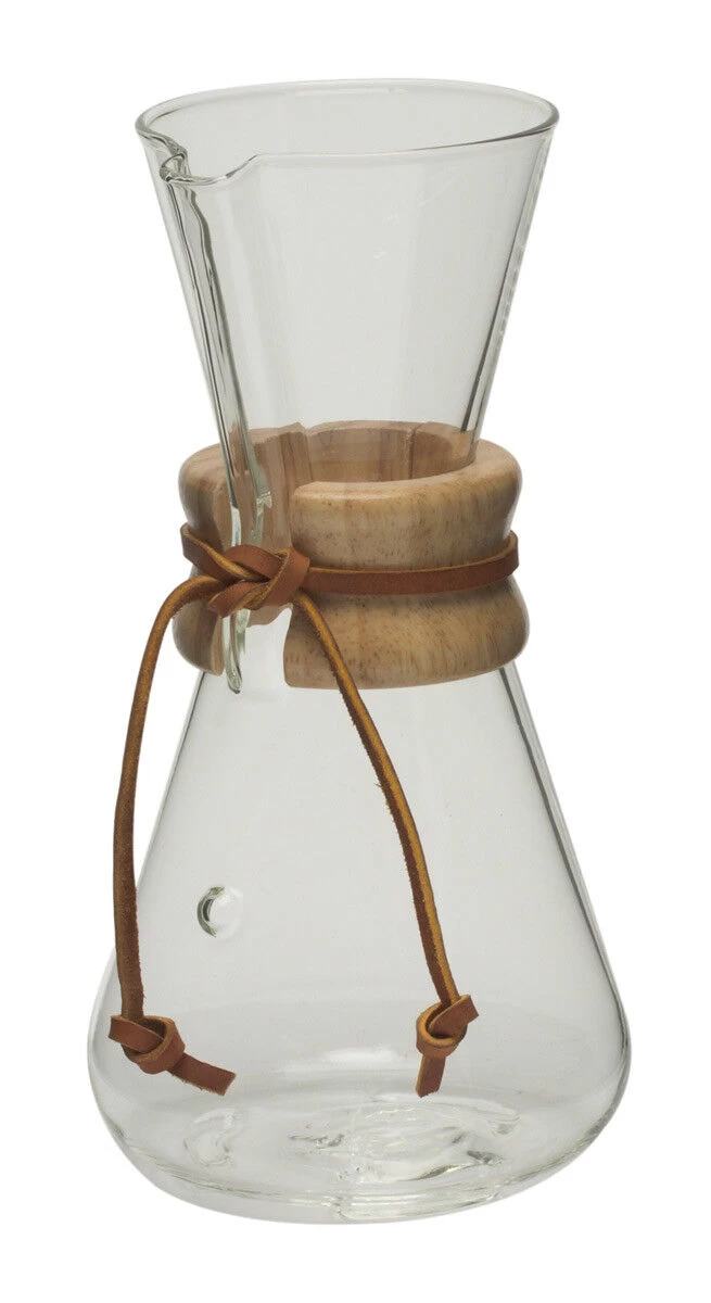 De vorm van de Chemex koffiemaker verraad zijn herkomst uit het laboratorium. Gebaseerd op de vorm van een erlenmeyer met glazen trechter, wordt de koffiepot van in één stuk mondgeblazen glaswerk gemaakt. Voor een gelijkmatig zetproces is er een schenktuit toegevoegd die tevens dient om lucht langs het filterpapier te laten ontsnappen tijdens het opschenken. De combinatie van vorm en het speciale filterpapier geeft een koffie zonder onnodige oliën of bittere aroma’s.