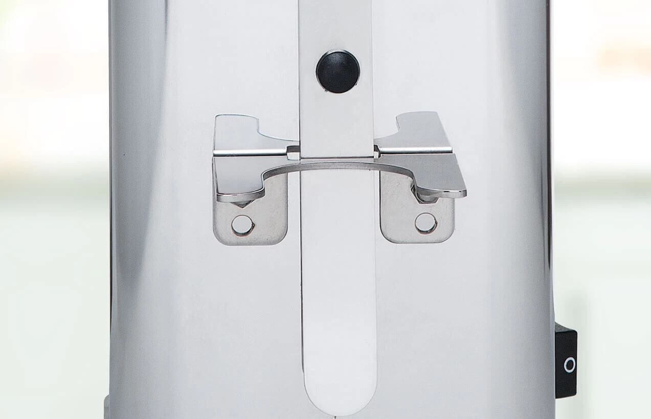 De koffiemolen heeft aan de zijkant een aan-/uitschakelaar, en aan de voorzijde steunen waarop u de filterdrager kunt rust. Deze steunen kunnen in hoogte worden versteld. Zodra u de drager in de steunen legt, tegen de activatieknop aan, start de molen automatisch.