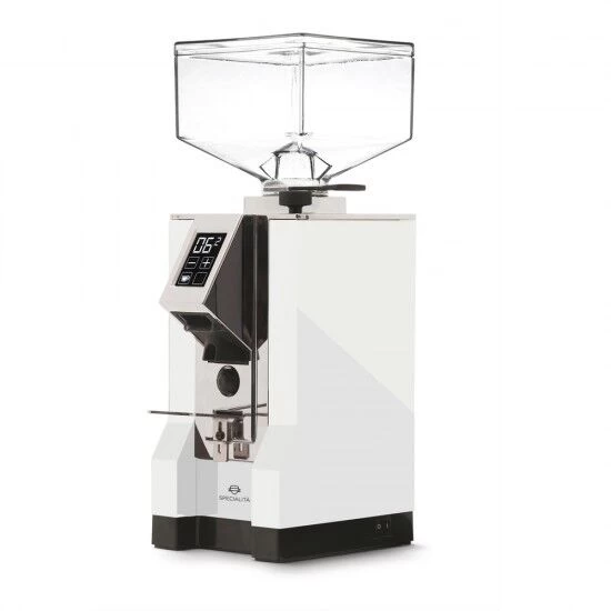 De witte Eureka Mignon Specialita koffiebonenmolen is voorzien van een doseertimer én is ook handmatig te bedienen. De molen heeft een stalen behuizing met een vierkante vormgeving en is 33 cm hoog, 16 cm lang en 11 cm breed. Het transparante kunststof bonenreservoir is groot genoeg voor circa 300 gram koffiebonen.