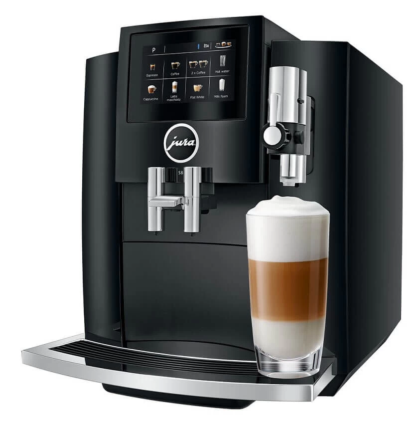 Met de JURA S8 espressomachine zet u verschillende koffiespecialiteiten, zoals latte macchiato of espresso. De S8 is een zeer compacte volautomatische espressomachine die met één druk op de knop cappuccino en 14 andere individueel programmeerbare specialiteiten kan bereiden uit hele of gemalen koffiebonen. De machine wordt heel eenvoudig aangestuurd vanaf het grote touchscreen display aan de voorzijde. Een lichte aanraking is voldoende om zowel korte als lange koffiespecialiteiten te zetten.