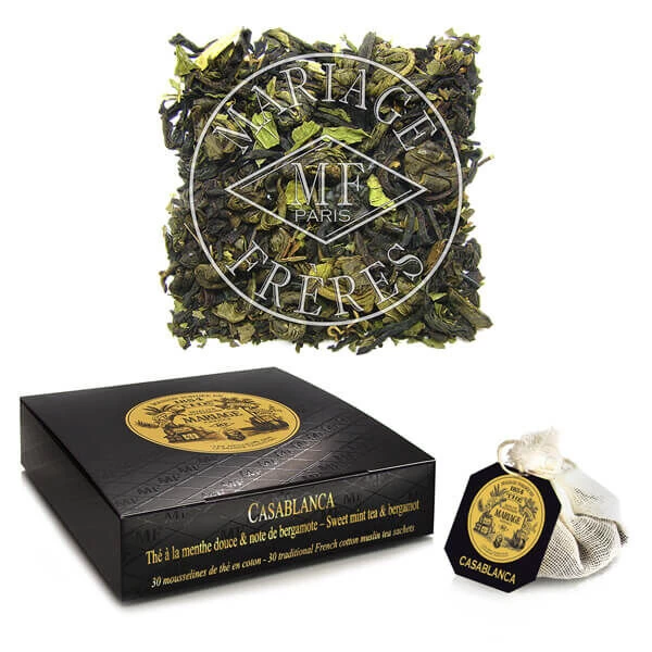 Mariage Frères-thee komt in een zwart doosje met een inhoud van 30 zakjes thee. De Casablanca is een smaakvolle melange van zwarte en groene thee met munt en bergamot.